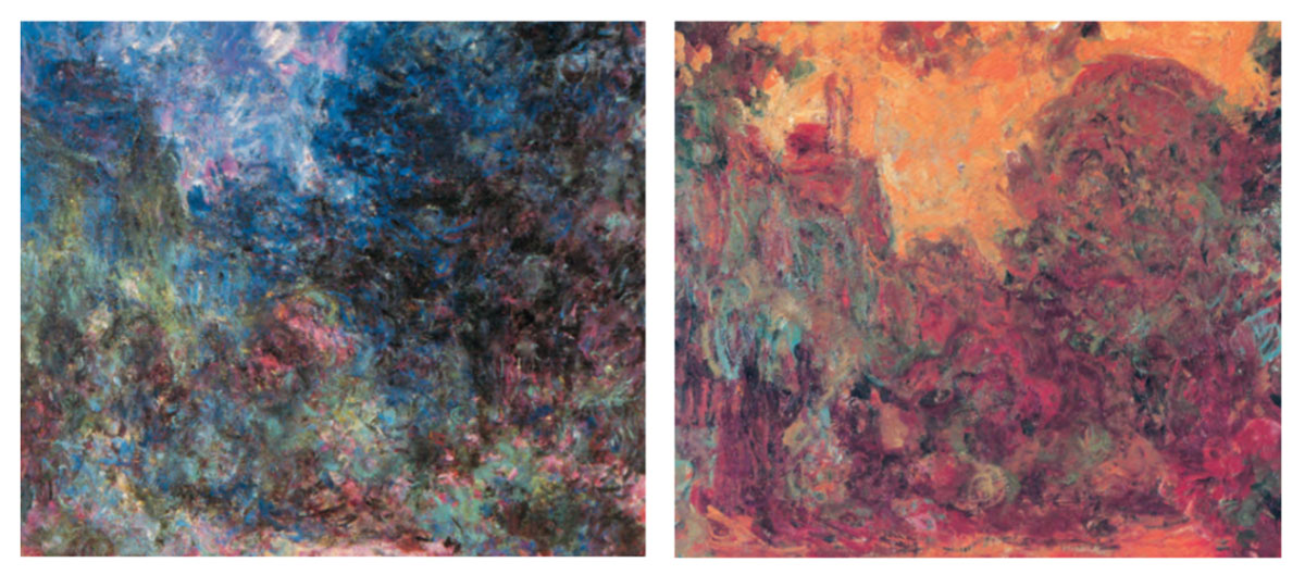 Para ilustrar su problema, le envió al doctor dos cuadros del mismo paisaje de su jardín de Giverny, el puente japonés sobre la laguna que alojaba sus nenúfares. En la obra pintada con el ojo operado, primaban el azul y los colores fríos. En la pintada con el ojo con cataratas (que jamás se operó) abundaban los rojos y marrones.
